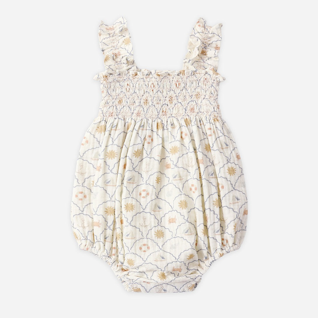 Julia Romperは、スモック生地の胸元と肩ストラップにフリルのディテールを施したデザインです。