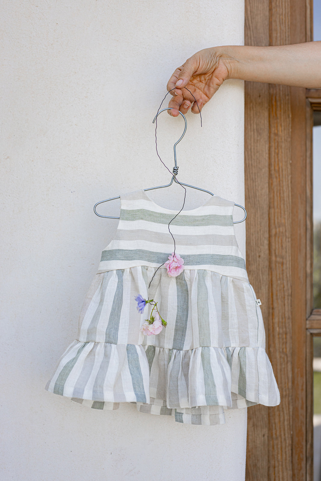 やわらかなベージュトーンのストライプが上品に映える、軽やかなサマーワンピース。