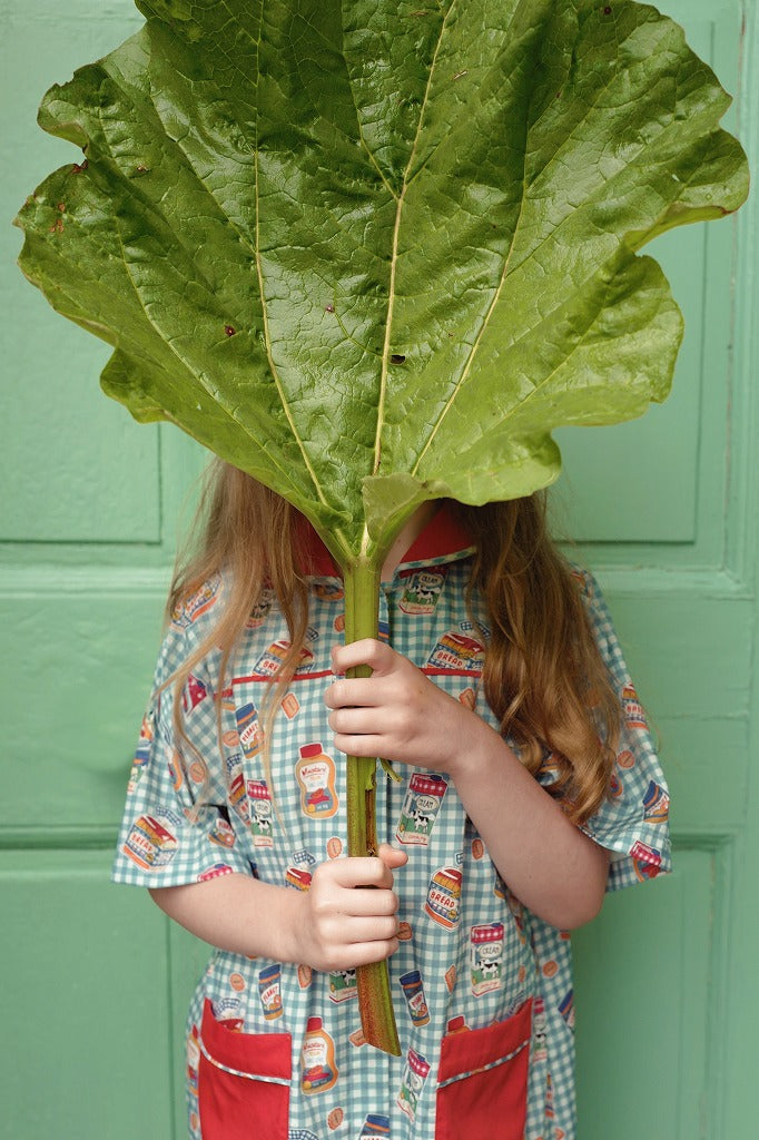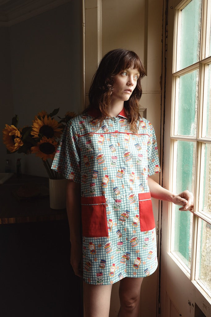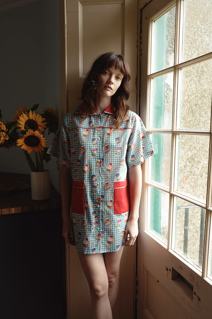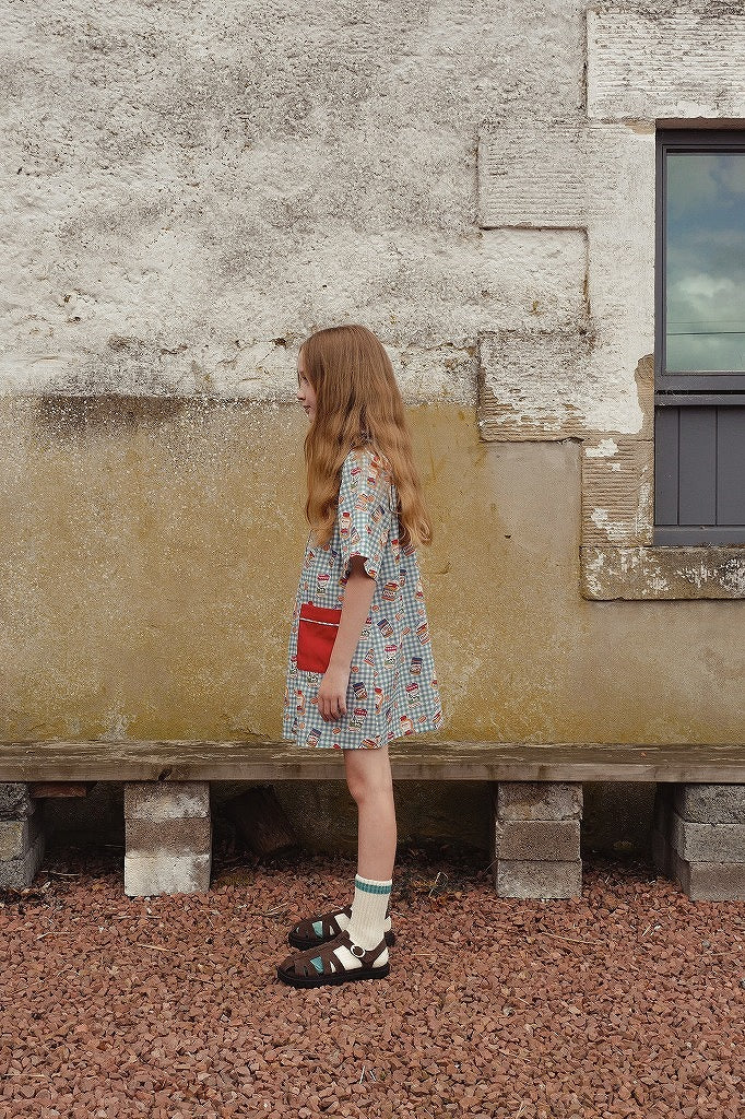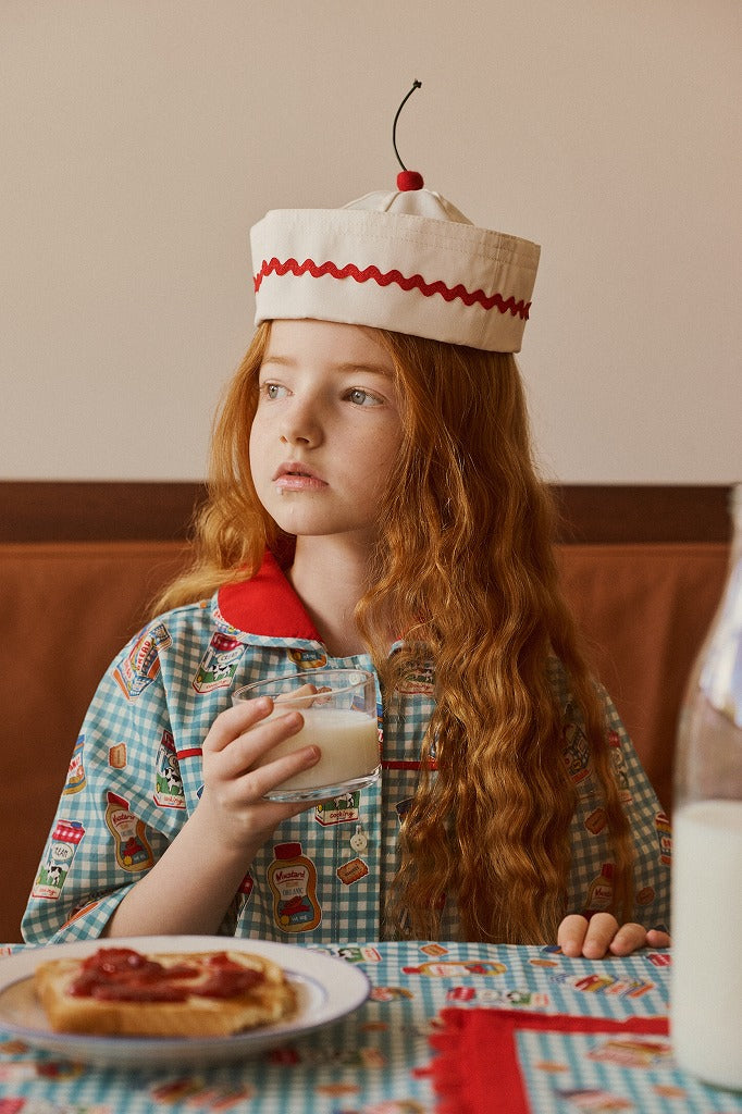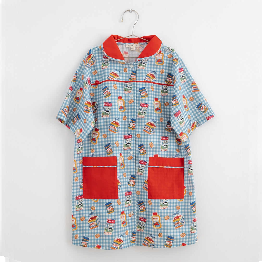 ブルー×ホワイトのギンガムチェックに、朝食モチーフのイラストがちりばめられたワンピース。