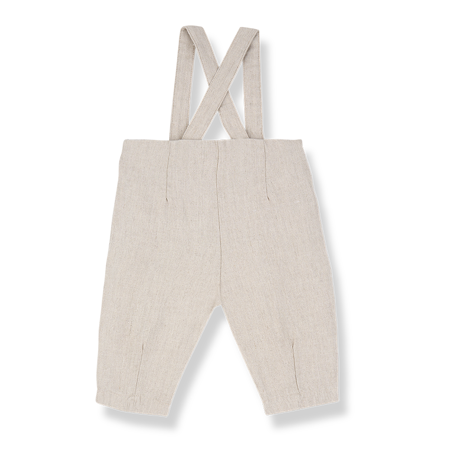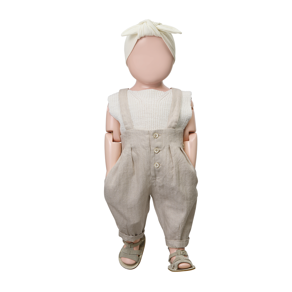 やわらかなベージュトーンが上品に映える、クラシックな雰囲気のオーバーオール。