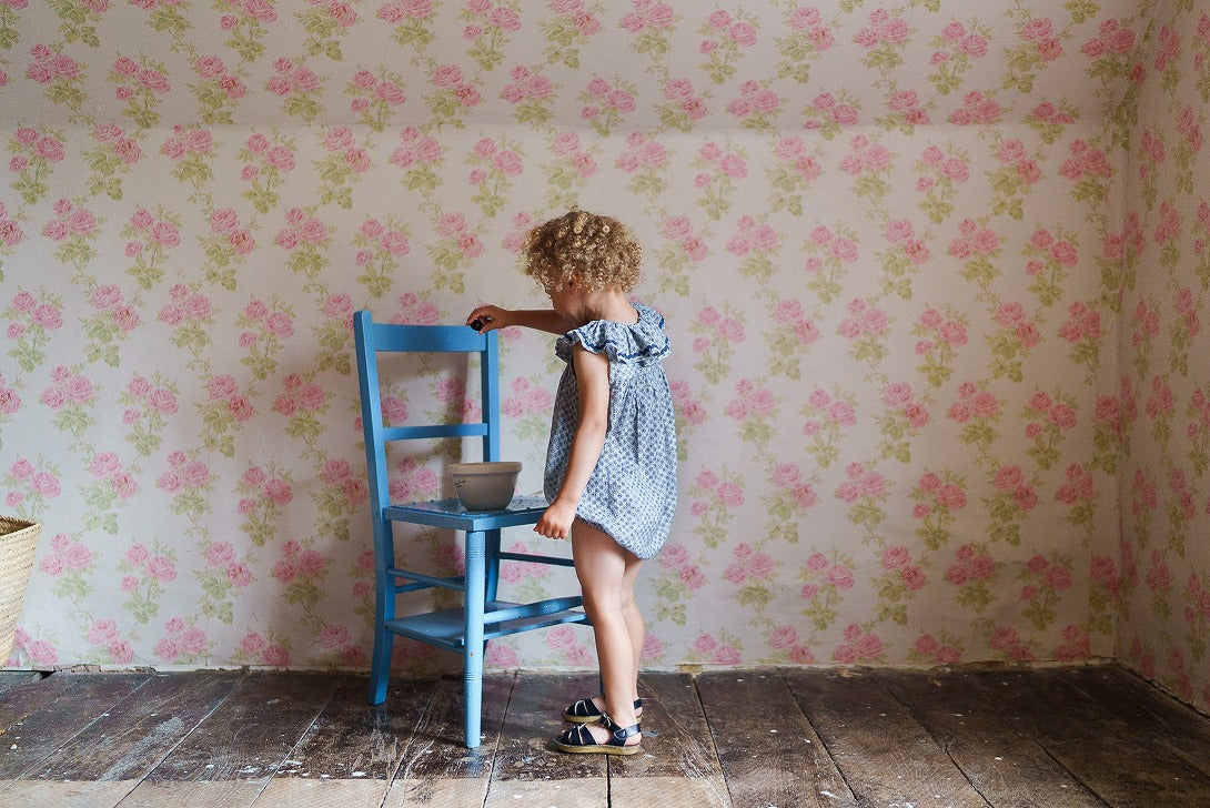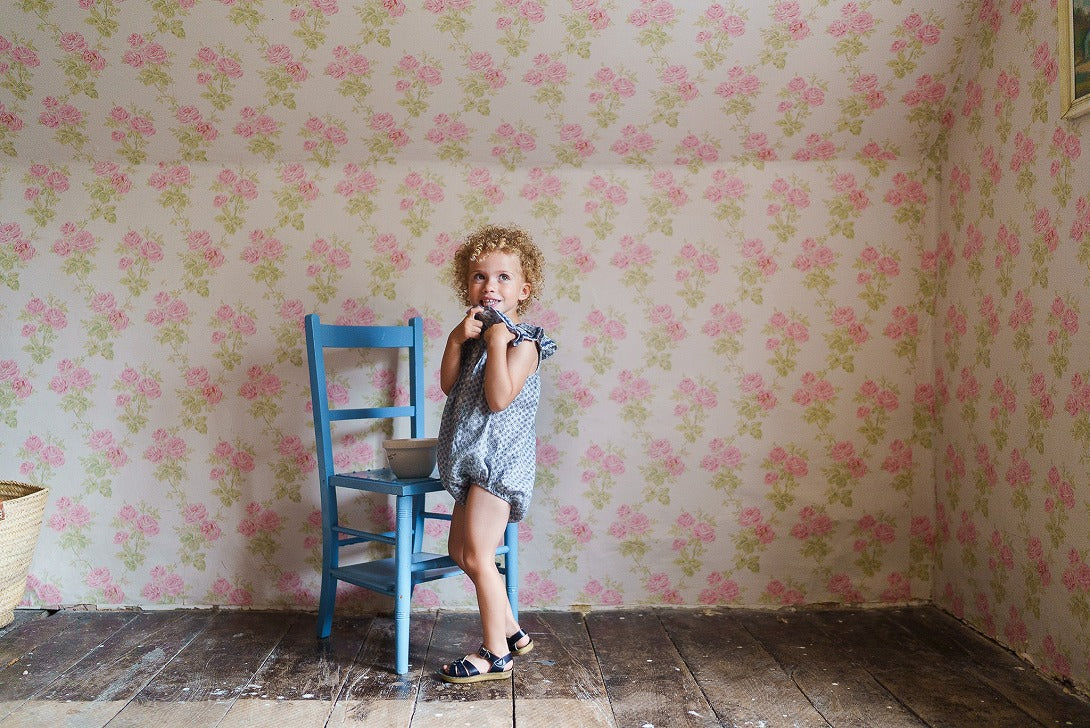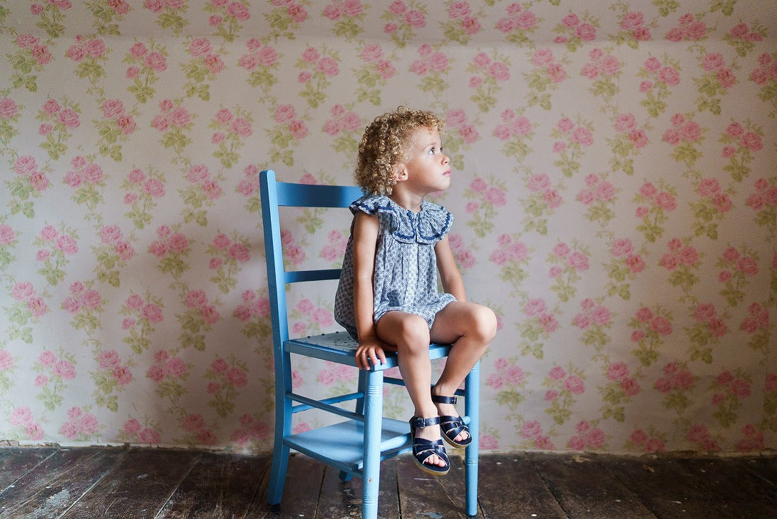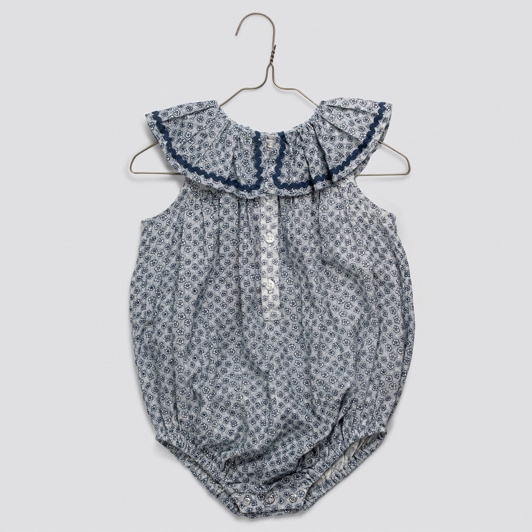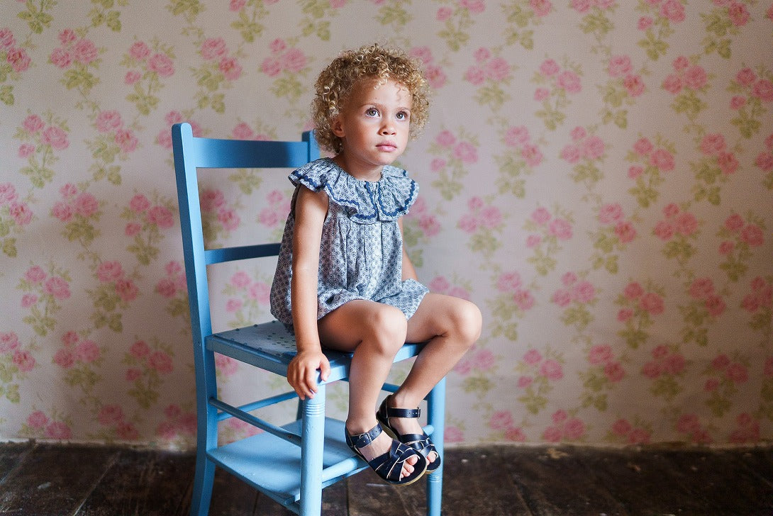 オーガニック素材のテンビー花柄生地を使用した、新しいスタイルのロンパースです。ヴィンテージ風のノースリーブロンパースは、首元にギャザーの入ったフリル、裾にはコットンのジグザグトリムがあしらわれています。裾はゴム入りで、スナップボタン開閉式なので、着替えやおむつ交換も簡単です。このロンパースは一枚で着ても、ニーハイソックスやコットンの手編みニットと合わせても素敵です。