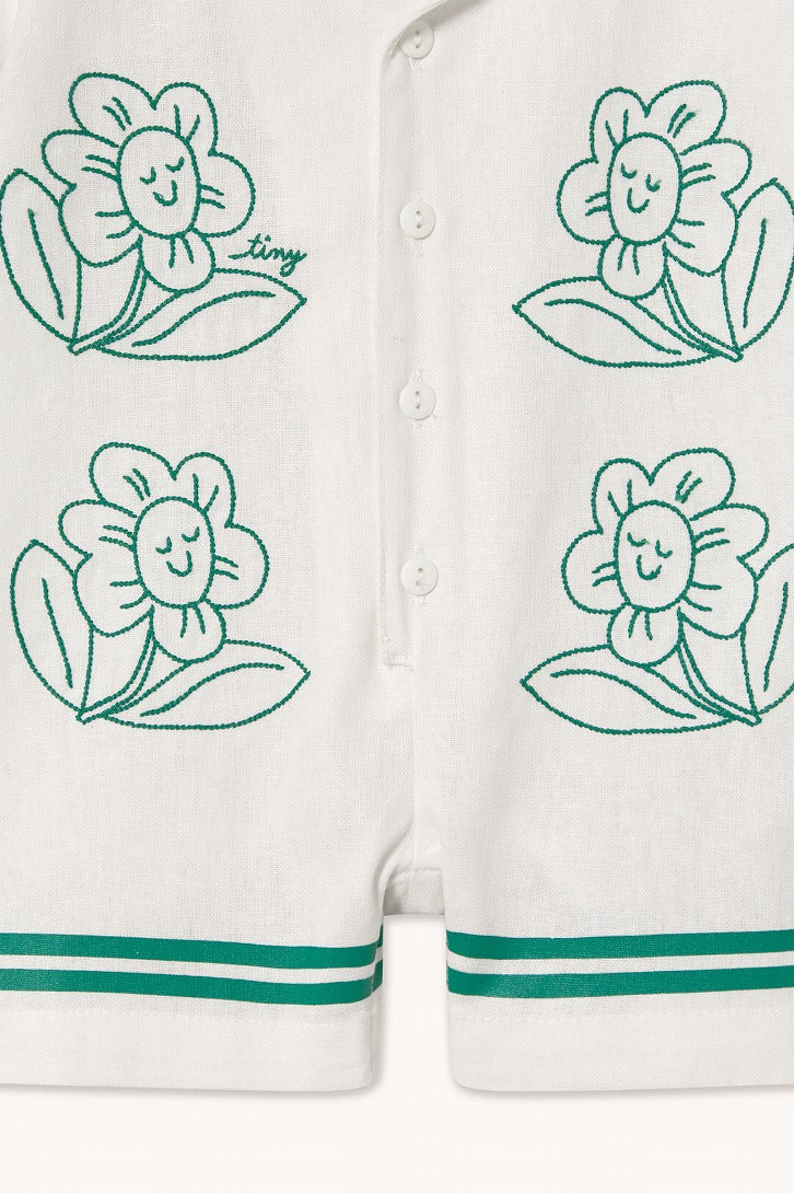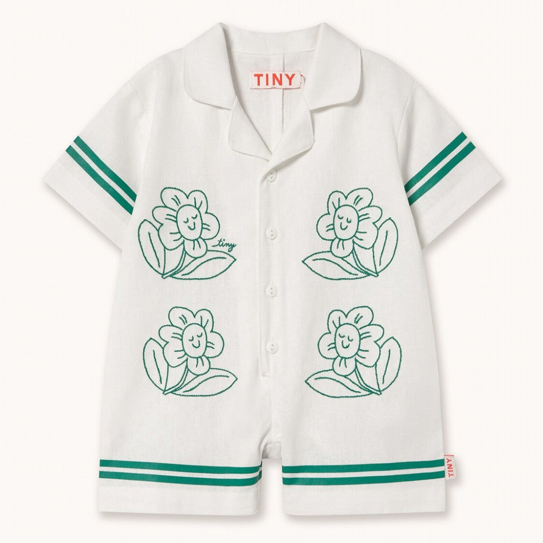 オフホワイトのリネン素材に、スマイルフラワーが並ぶロンパース。
