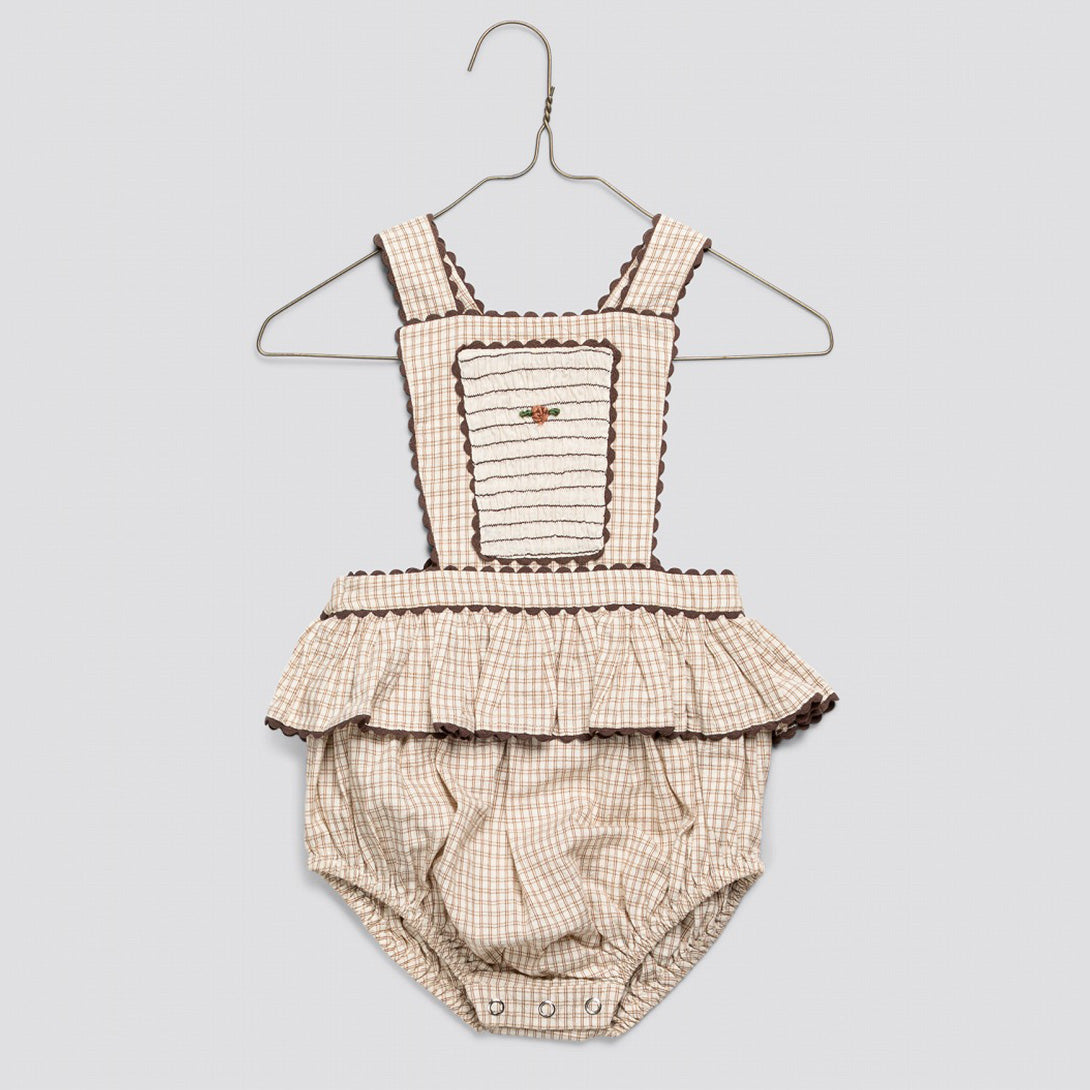 美しい織りコットンチェック柄のキュートなロンパース。背中のクロスストラップ、胸元の手刺繍パネル、フリル付きペプラムのフルブルマー風ボトムが特徴です。股下にはスナップボタンが付いているので、着替えも簡単です。下に可愛いブラウスや、当店の半袖ポインテルTシャツを合わせるのにぴったり。特別な日にも普段使いにも最適な、実用性と懐かしい魅力が融合したタイムレスな一枚です。