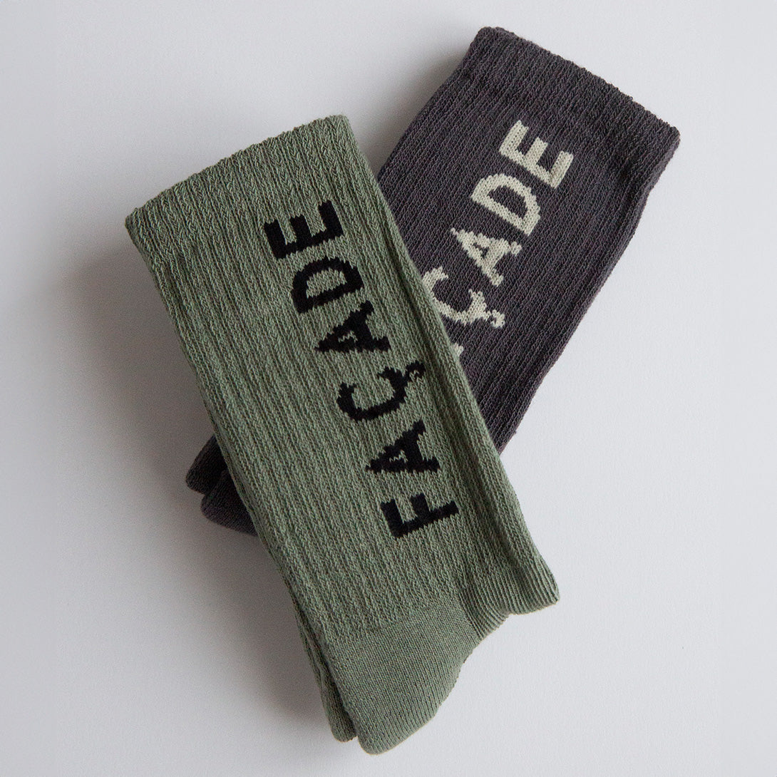 グリーンとグレーの2色展開で、どちらも縦に配置された“FAÇADE”ロゴがアクセント。