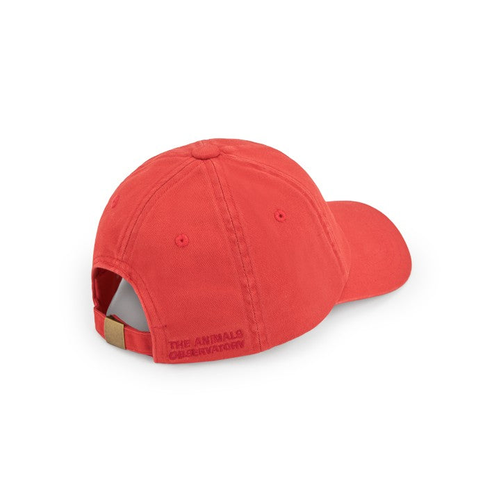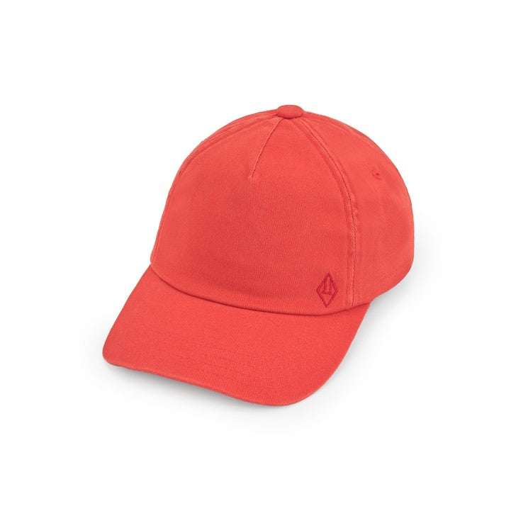 鮮やかなレッドに、フロントの刺繍ロゴが映える元気いっぱいのキッズキャップです。