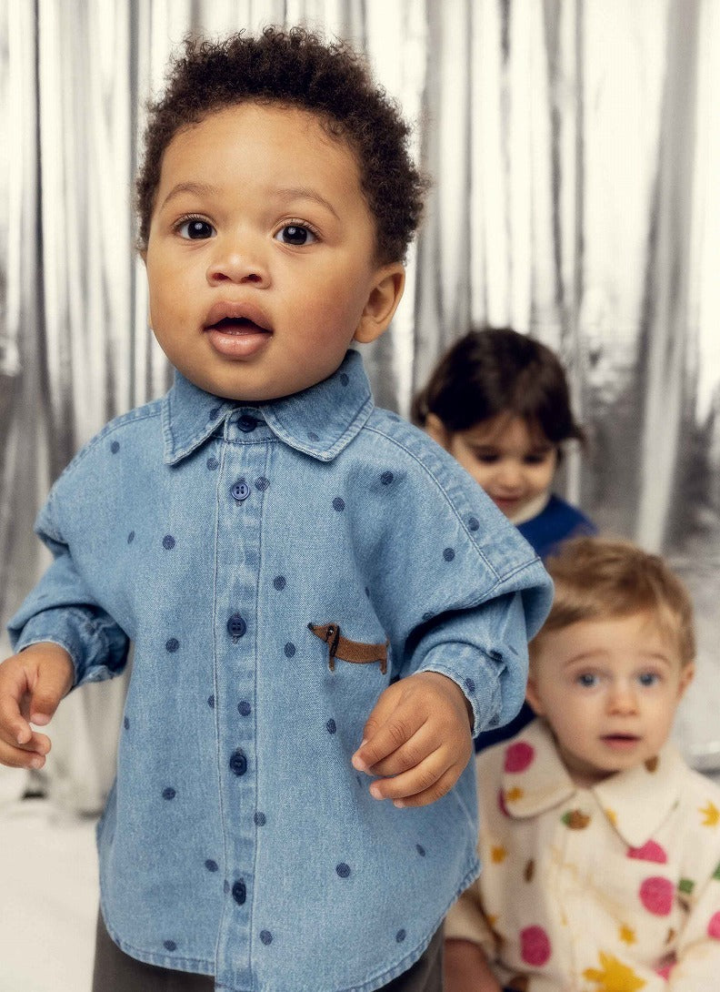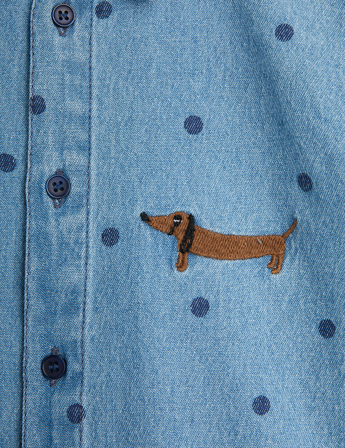 ドット柄とダックスフンド刺繍がアクセントになった、ライトデニムの長袖シャツ。