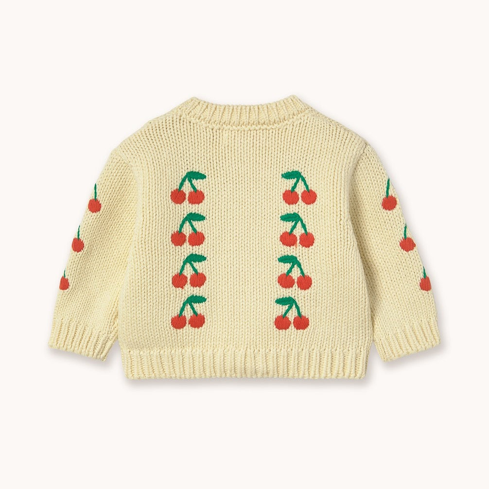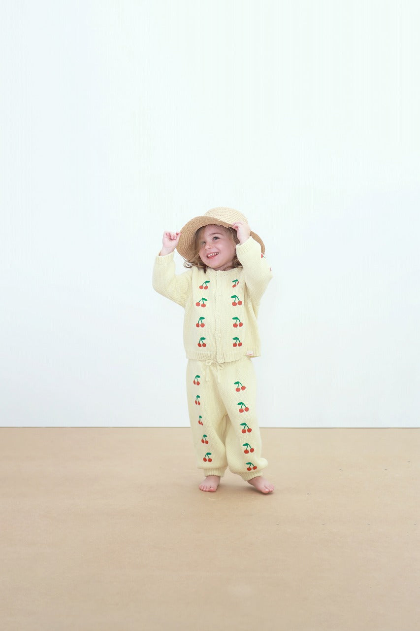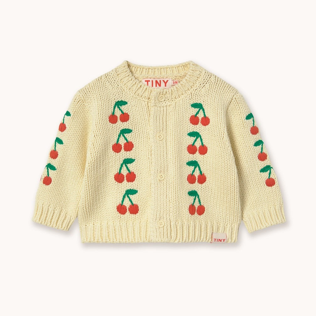 ダスティイエローのニット地に、赤いさくらんぼ柄が並んだカーディガン。