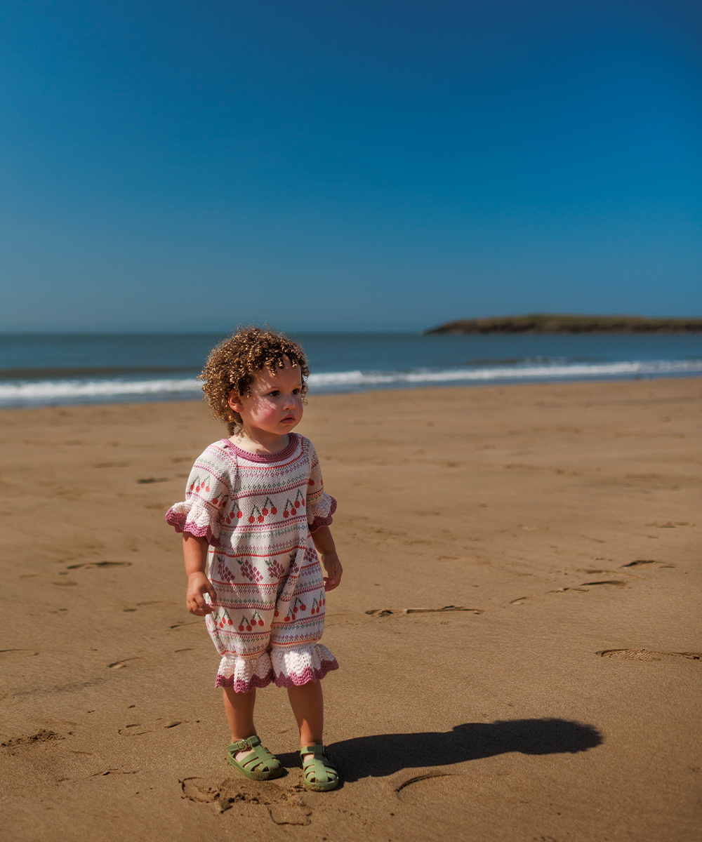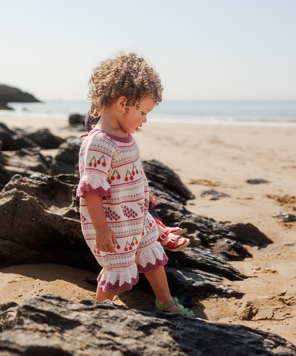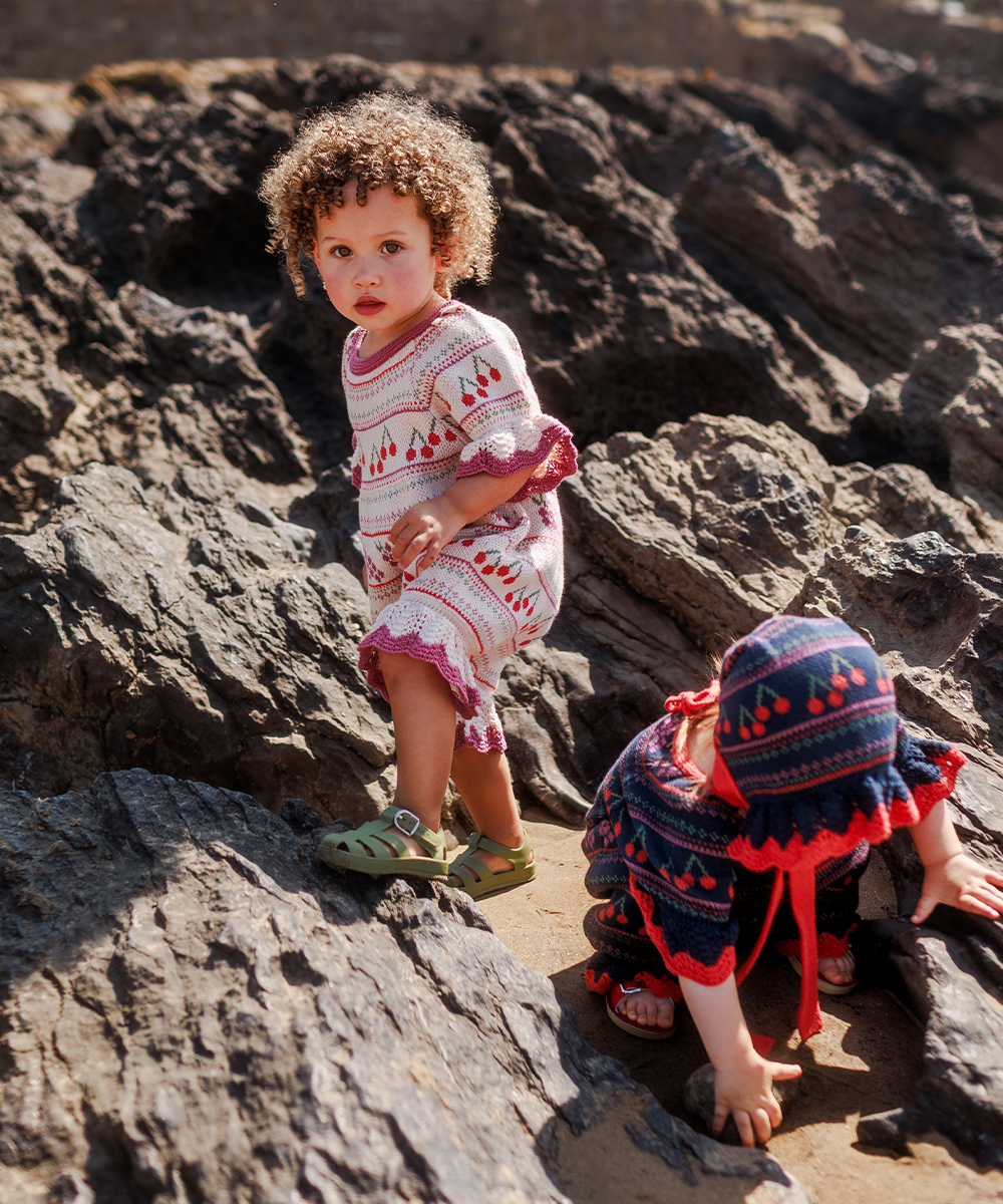 チェリーやブドウをモチーフにしたフルーティなジャカード編みがアクセント。