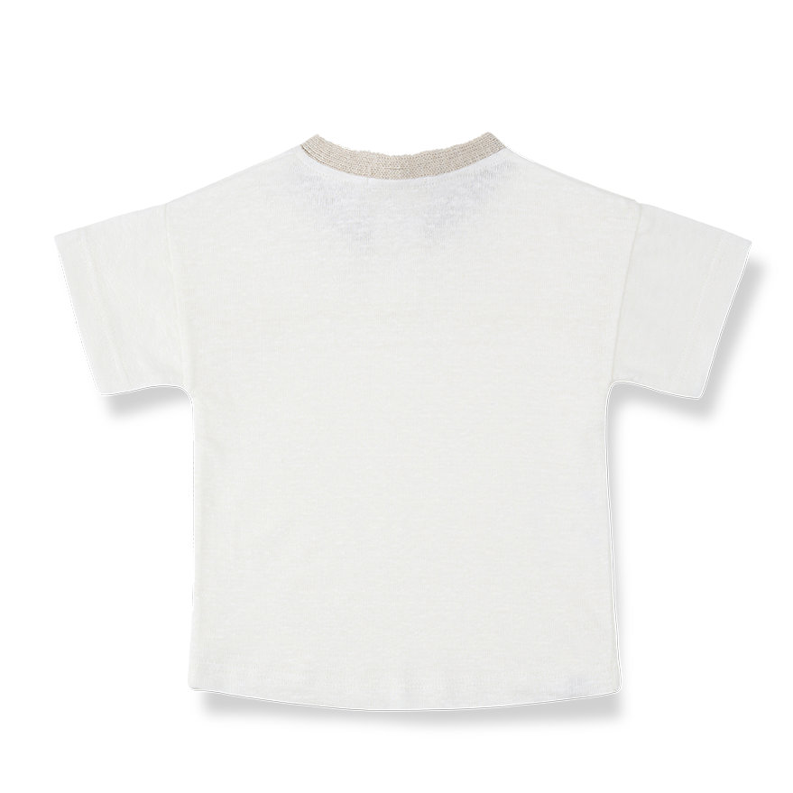 やわらかなオフホワイトに、首元のコントラストカラーがさりげなく映えるミニマルなTシャツ。