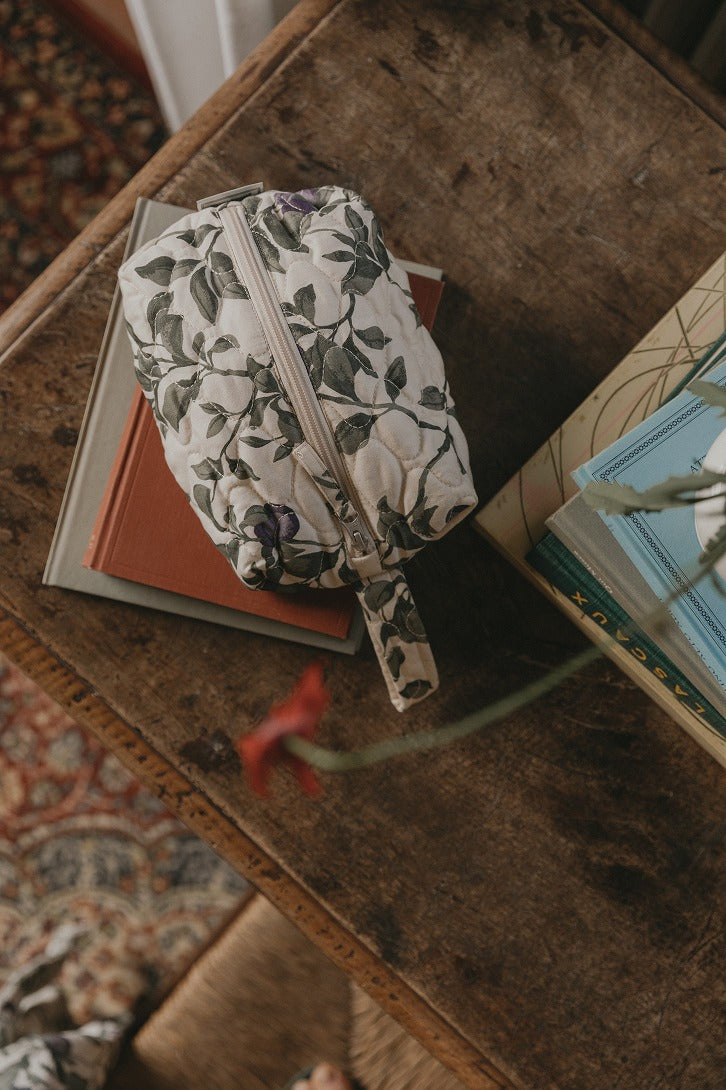 やさしい色合いと自然モチーフが魅力のキルティングポーチです。
