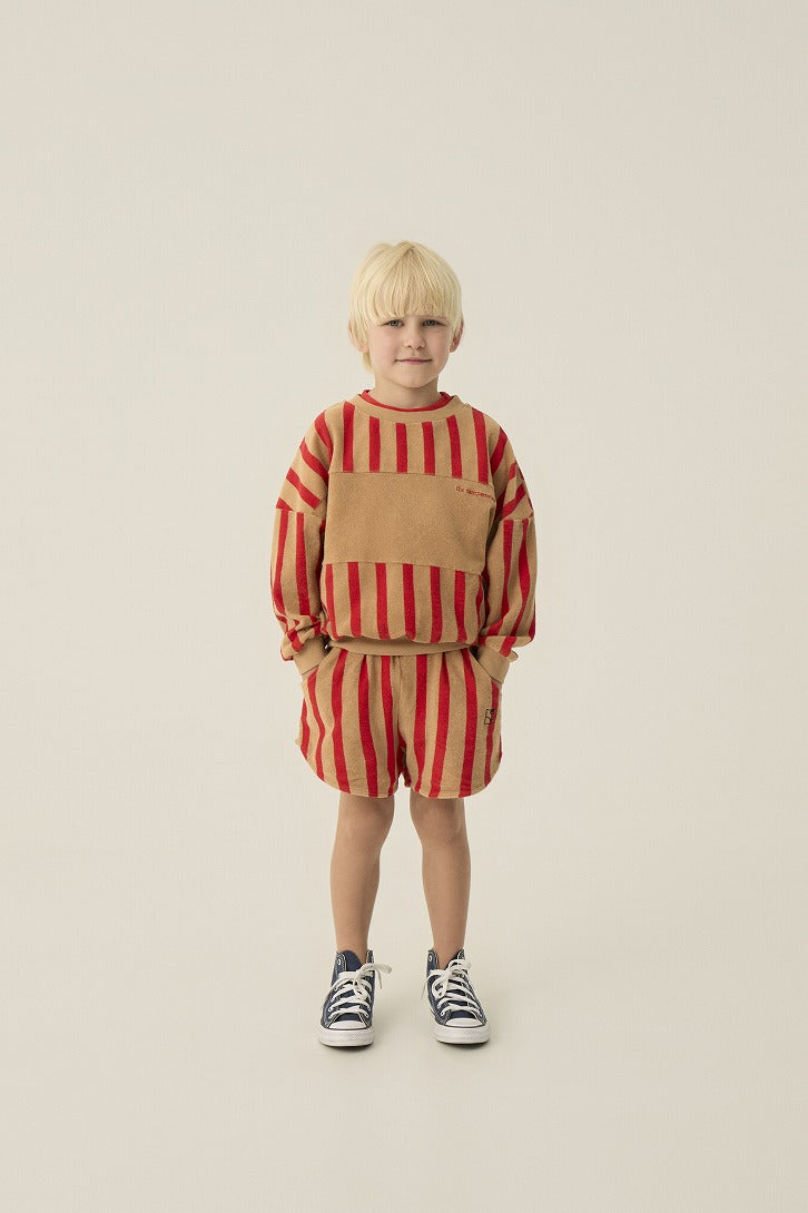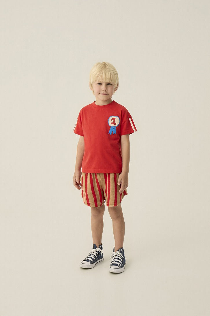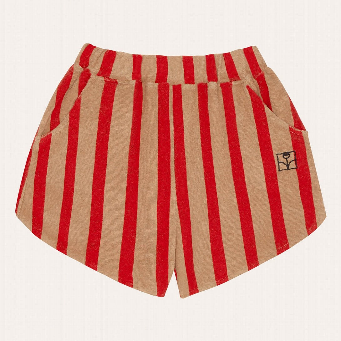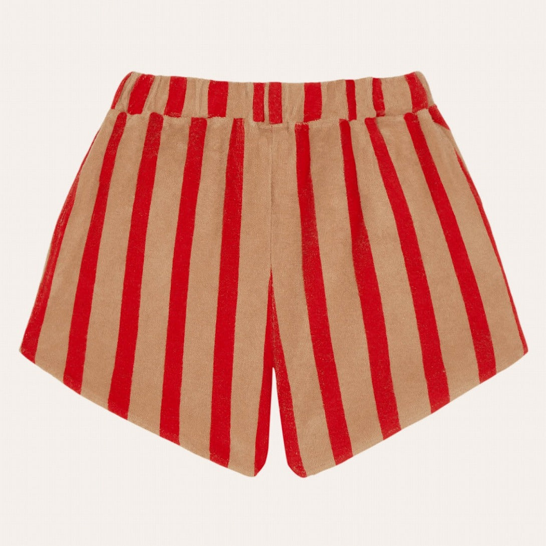 レッド×キャメルの縦ストライプが目を引くショートパンツ。