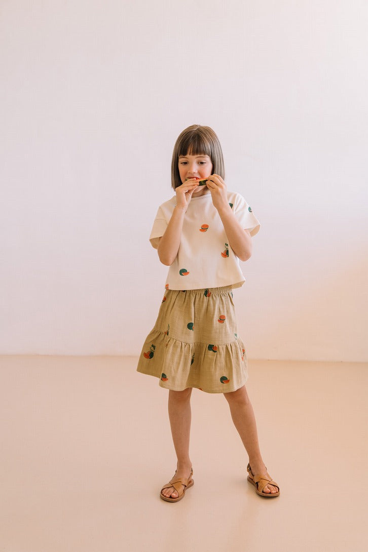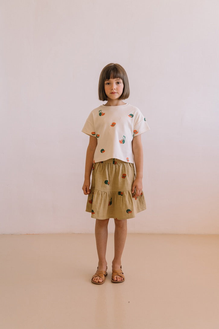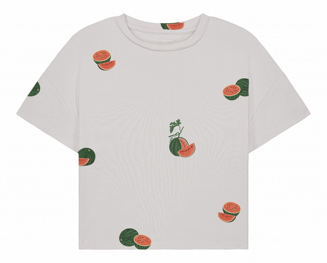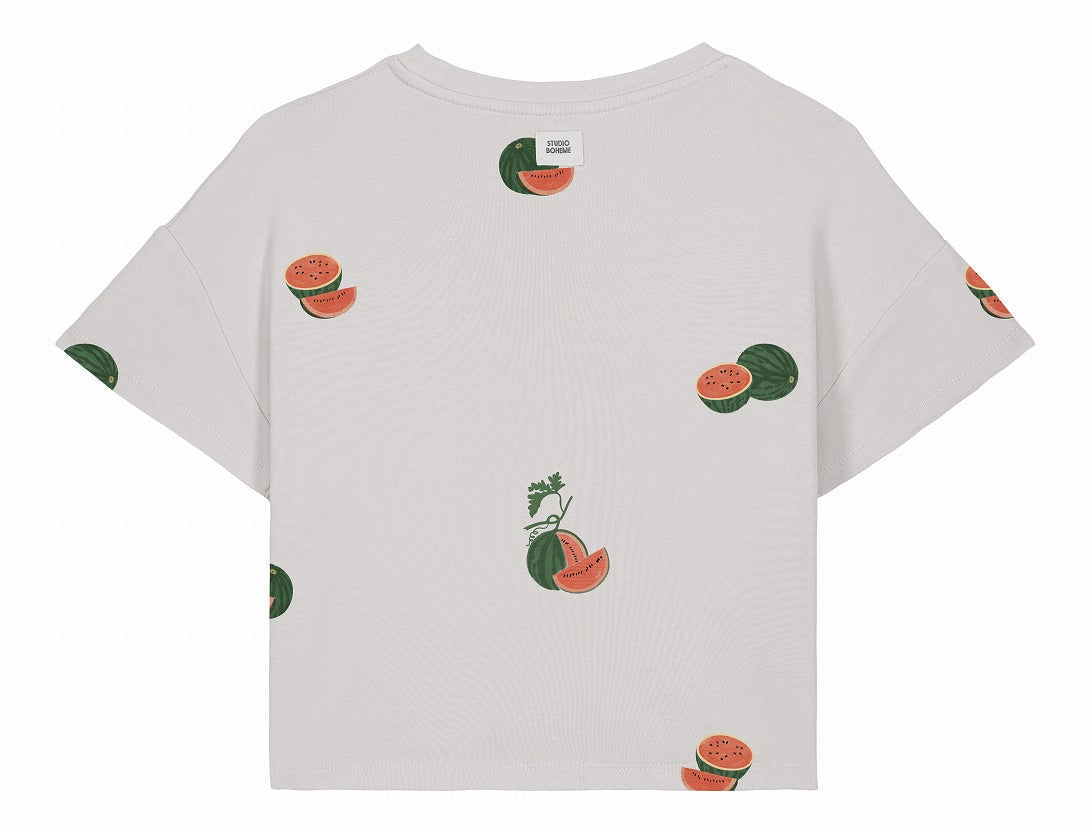 ゆったりとしたフィット感、クロップド丈、半袖、ラウンドネック。