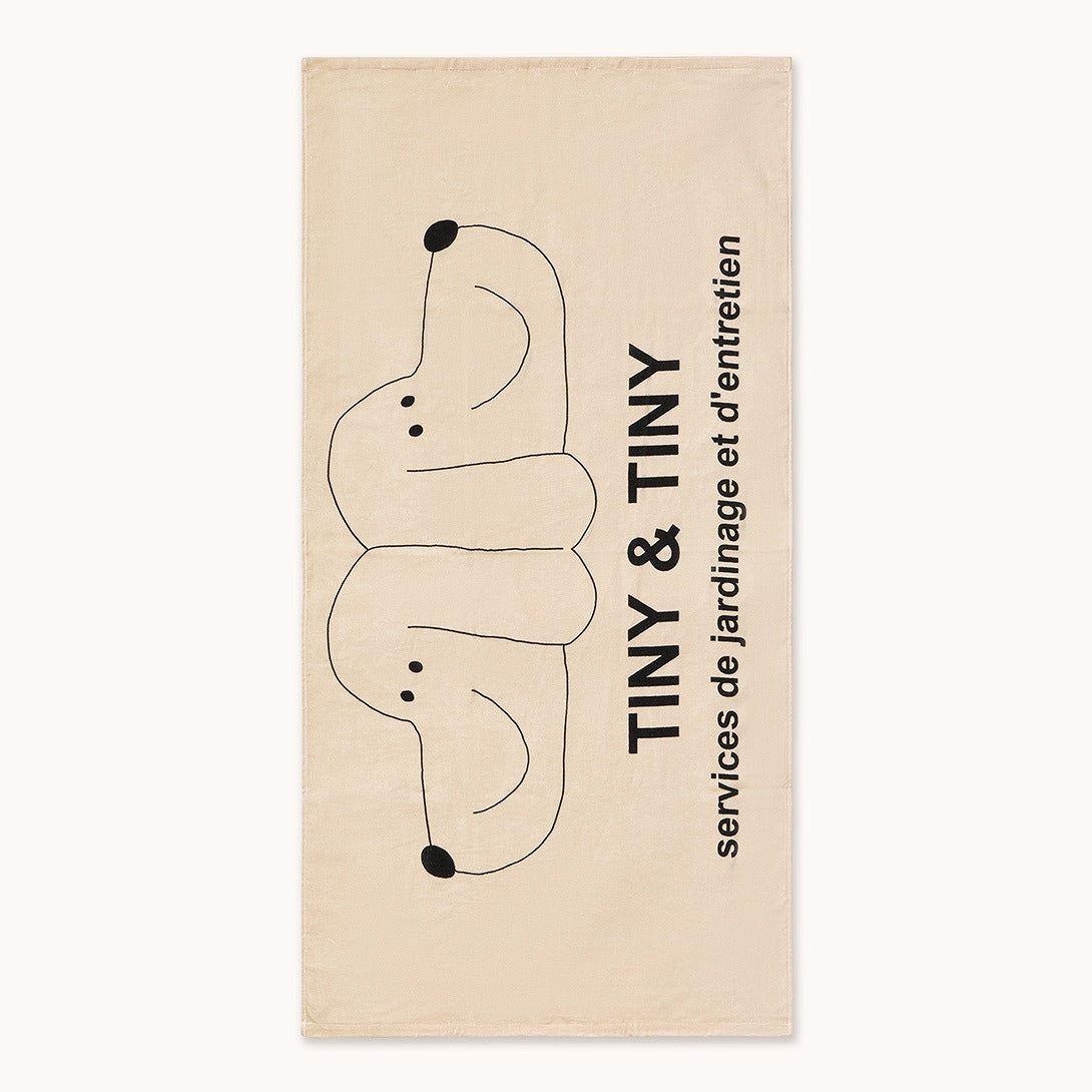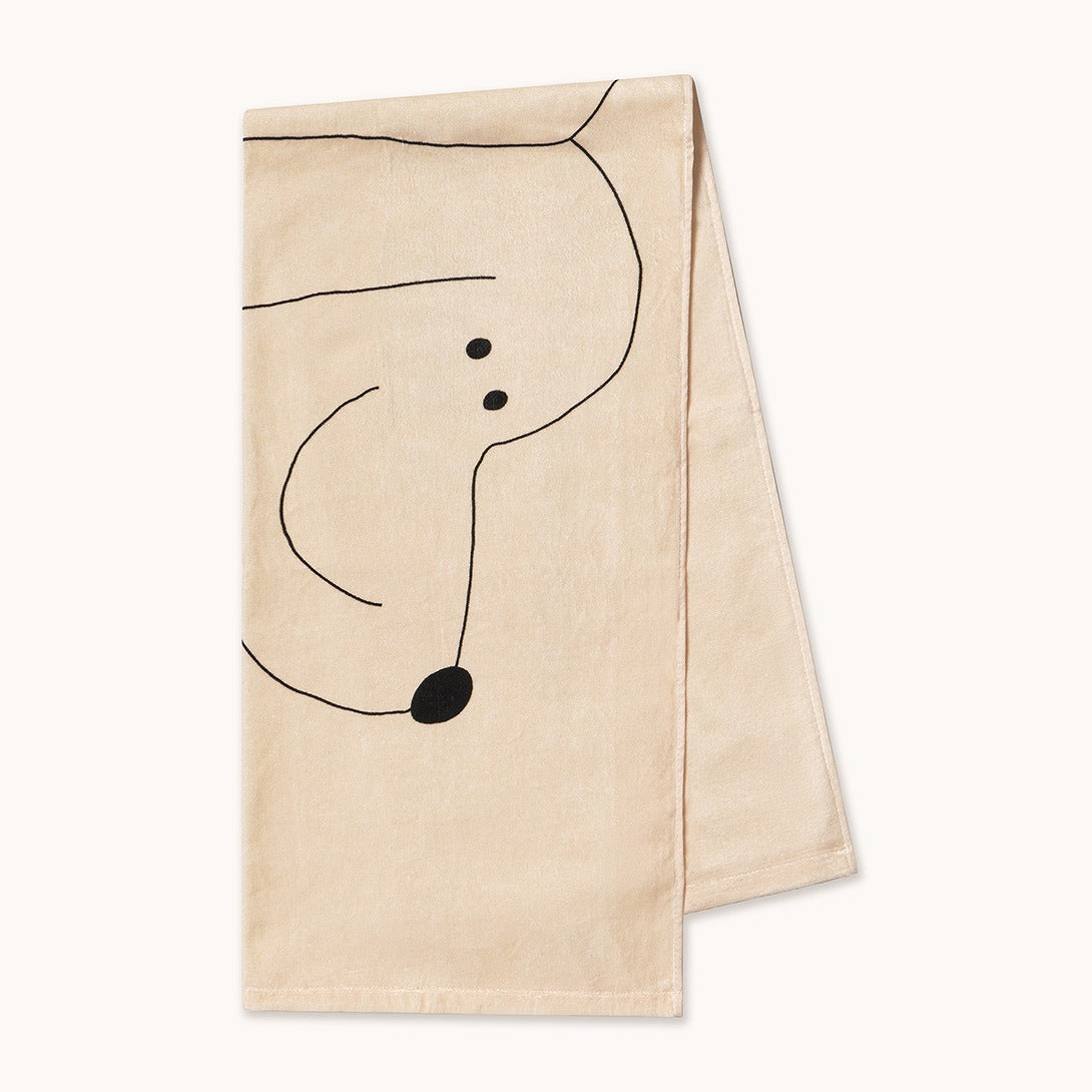 ライトクリームの柔らかなタオル地に、犬のイラストとロゴが描かれたタオル。