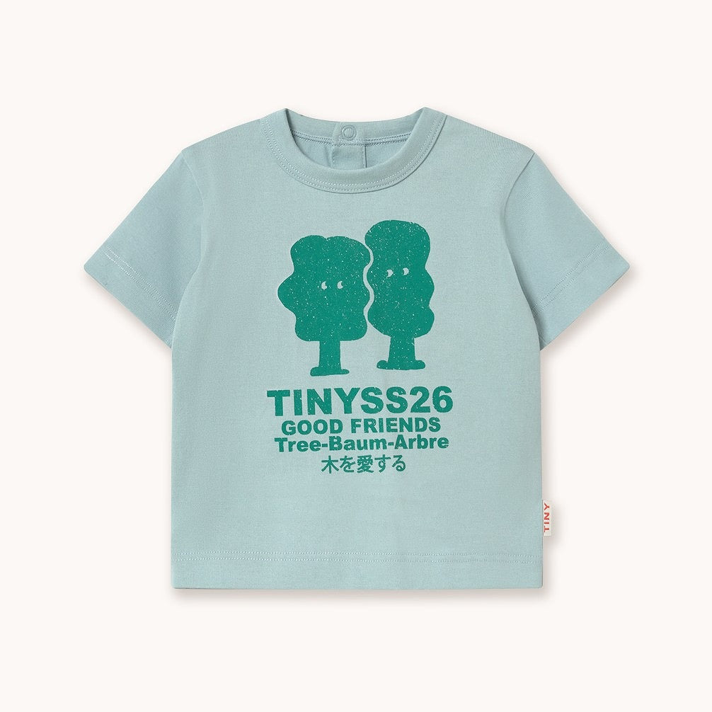 ウォームグレーのボディに、木のキャラクターが並んだグラフィックがプリントされたTシャツ。
