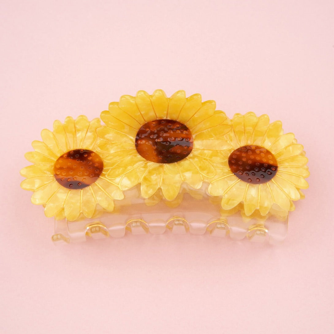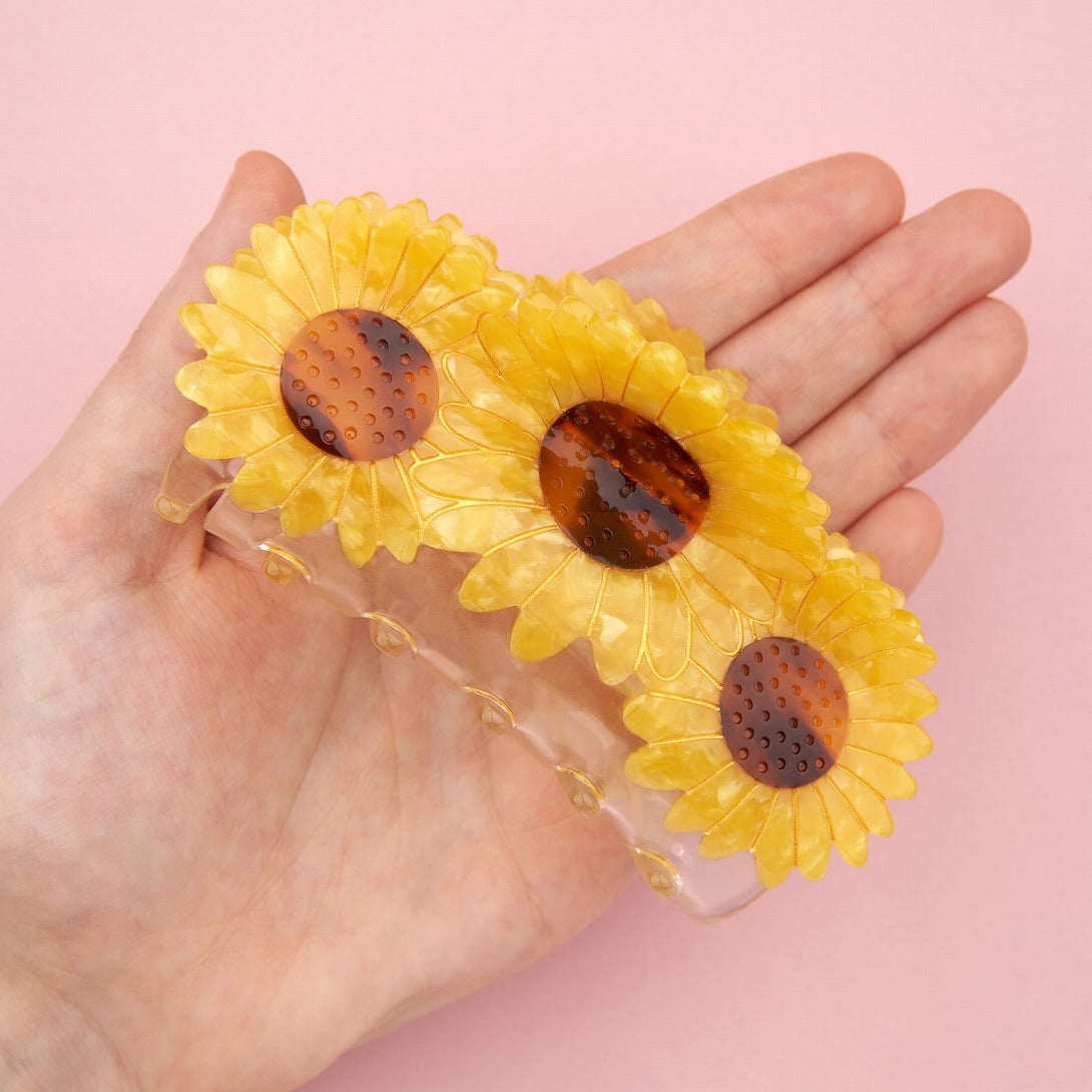 3つ並んだひまわりが目を引く、存在感たっぷりの大ぶりヘアクリップ