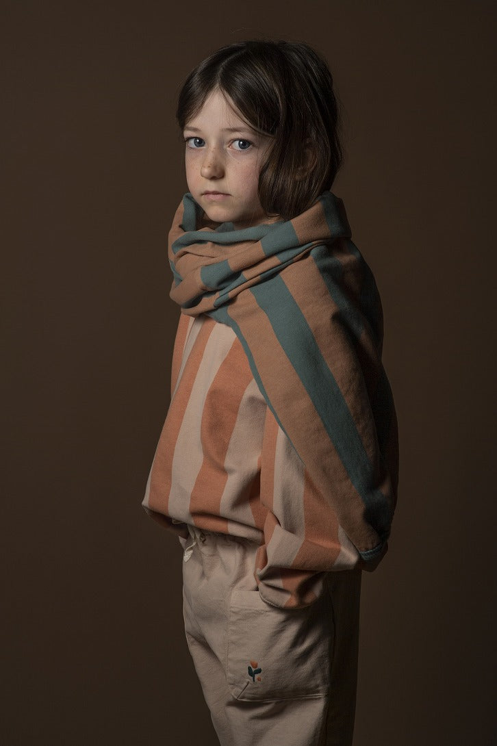 落ち着いたグリーンのストライプが印象的な、やわらかなスウェットです。