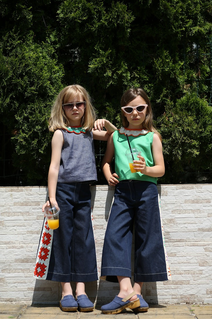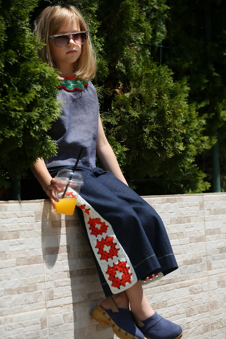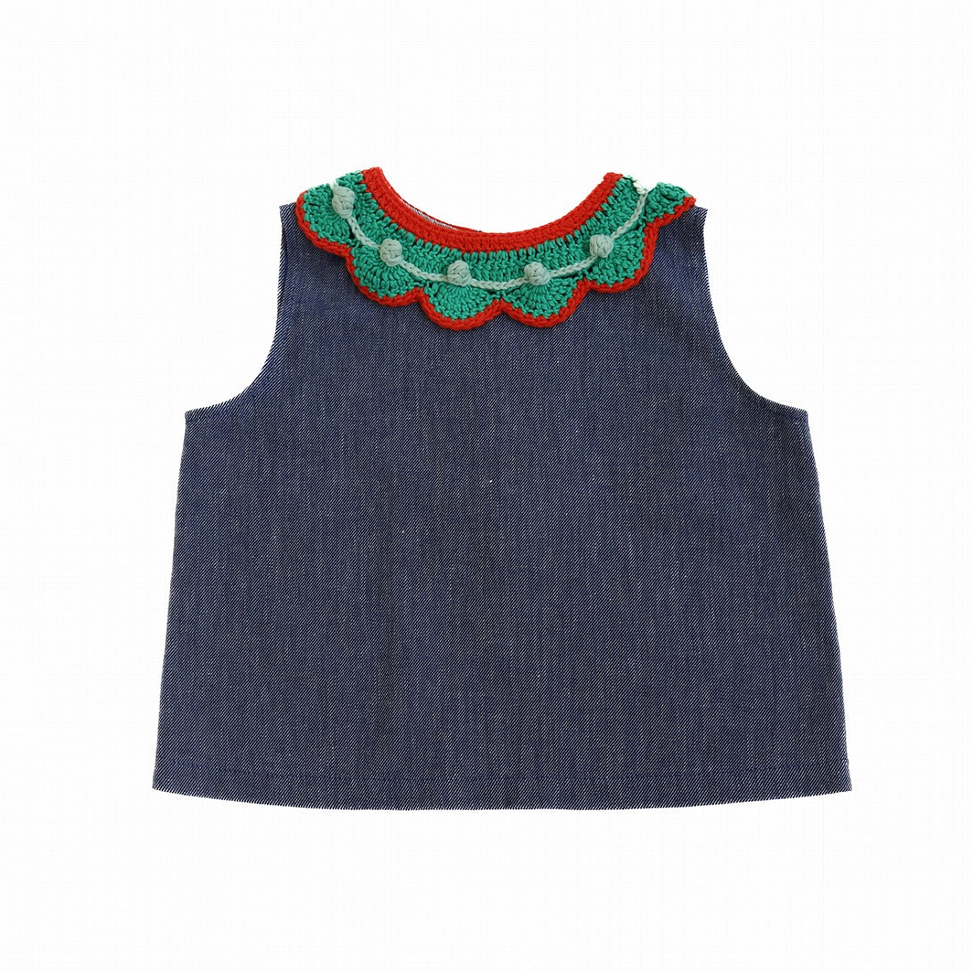 デニムの風合いが爽やかなタンクトップに、カラフルなスカラップのクロシェカラーが映えるデザイン。