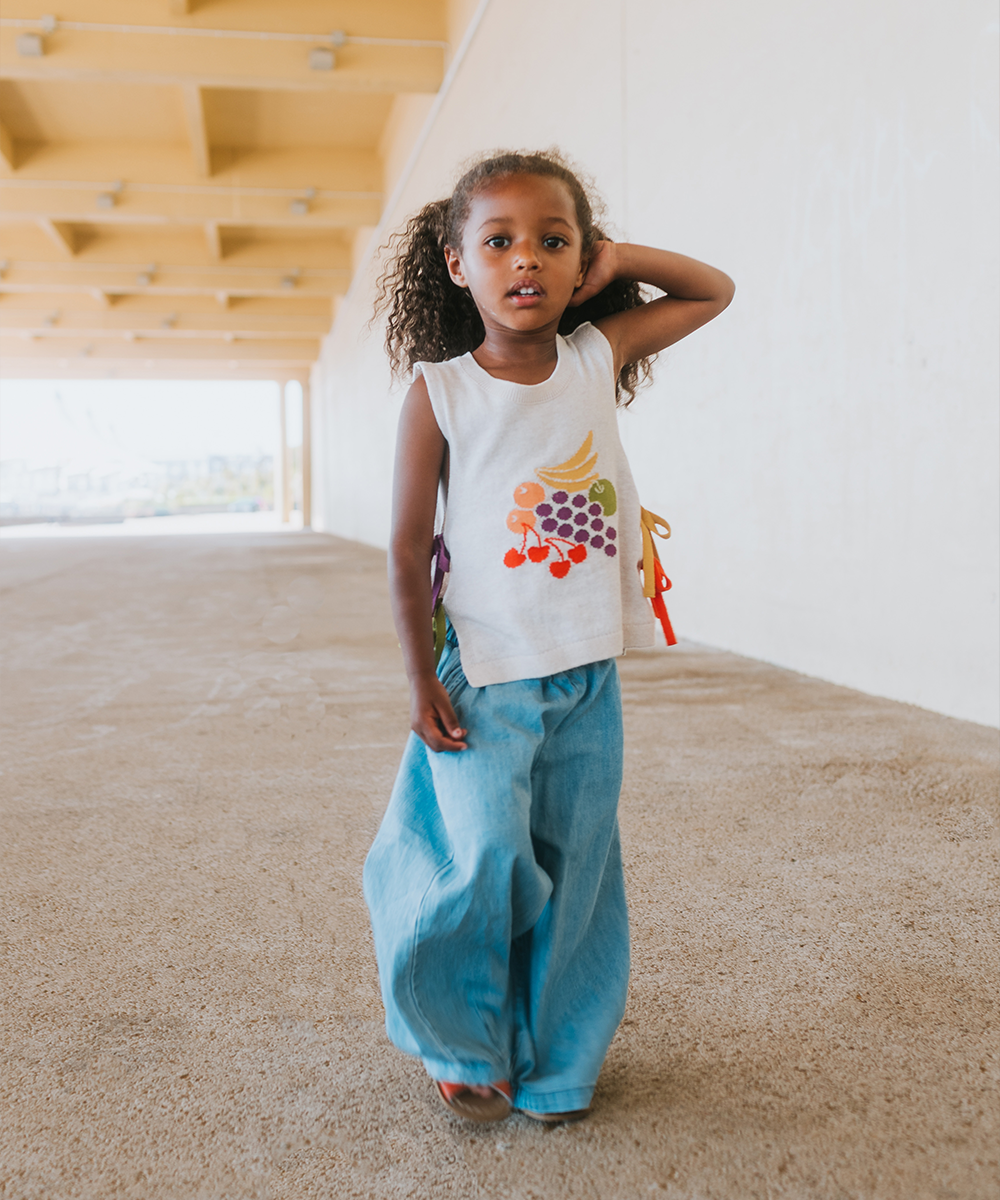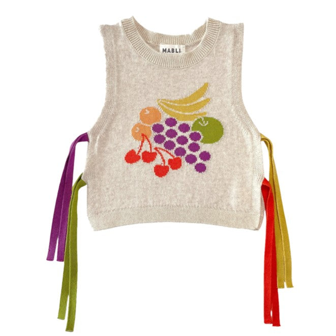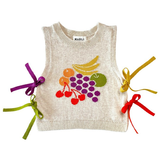 チェリーとブドウをモチーフにしたフルーティーなジャカード編みが魅力。