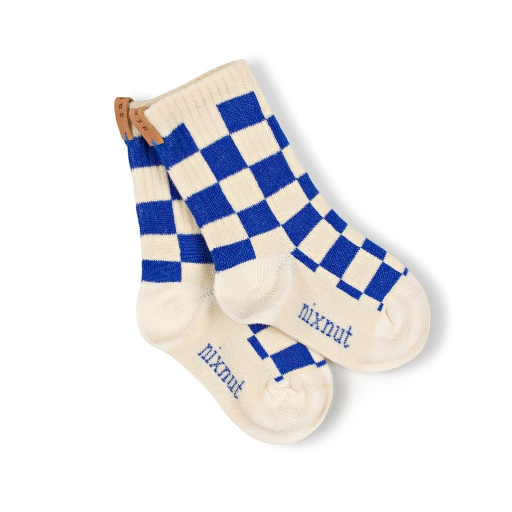 ブルー×ホワイトのチェッカーパターンが目を引くソックス。