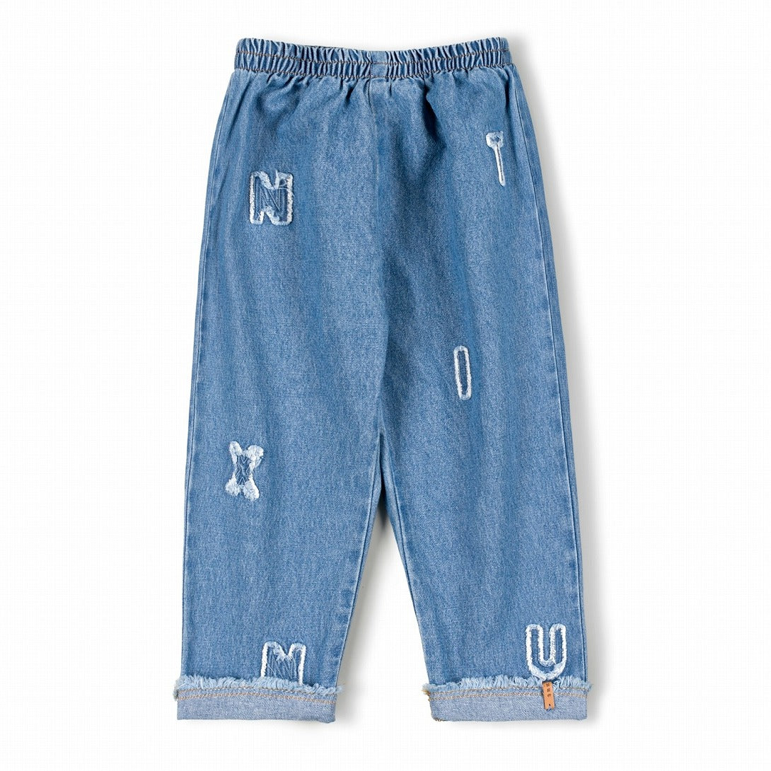 アルファベット刺繍が散りばめられた、遊び心あふれるデニムパンツ。