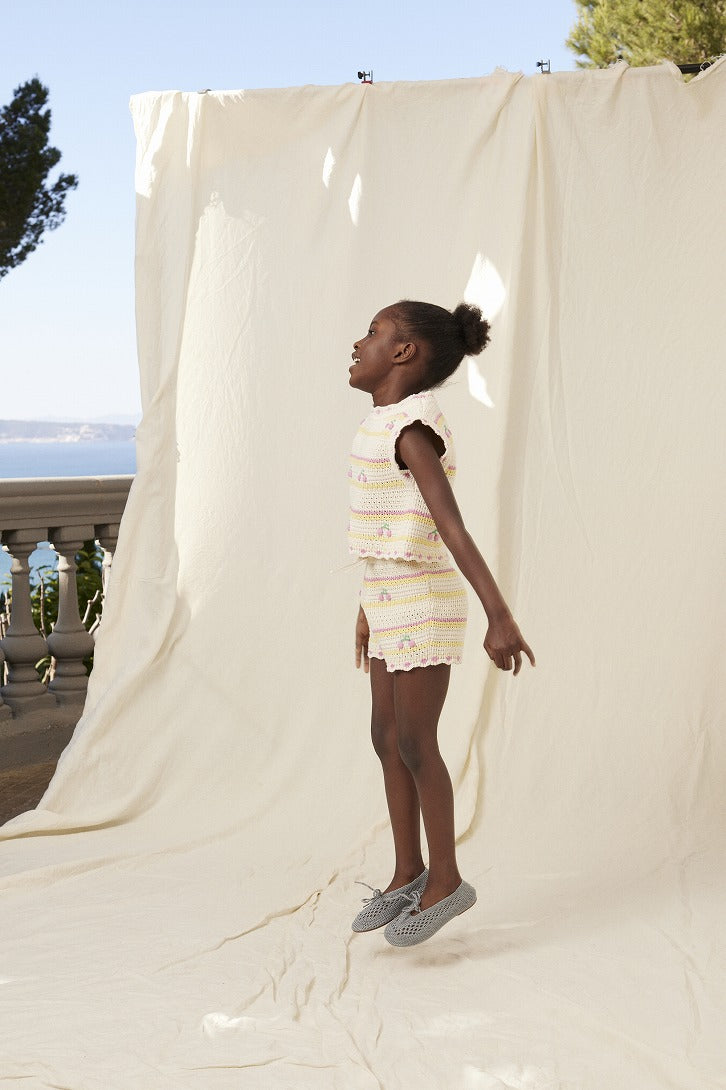 チェリーモチーフが愛らしく並ぶ、ストライプデザインのクロシェベスト。