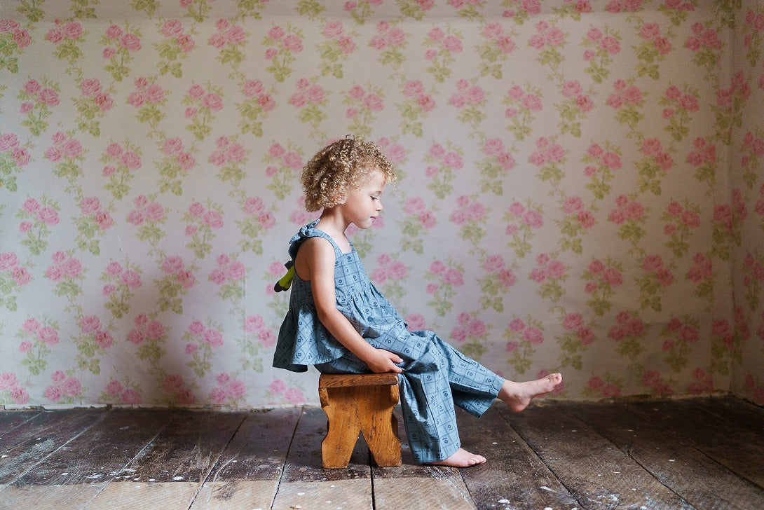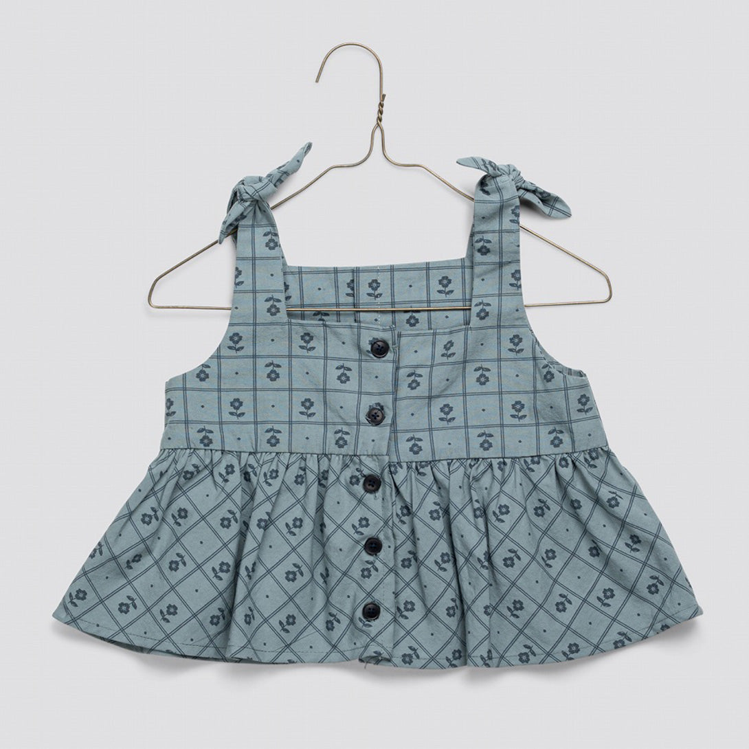 当店自慢の素敵なシャーリートップは、可愛らしいタイム柄のオーガニックコットン生地を使用しています。ノースリーブで、スクエアネック、肩には小さなリボンがあしらわれています。スカートはボリュームたっぷりのバイアスカットで、フロントにはボタンが付いています。とても可愛らしく、軽やかな着心地のサントップで、暖かい日には一枚で、肌寒い日には当店のコットンニットと重ね着するのもおすすめです。