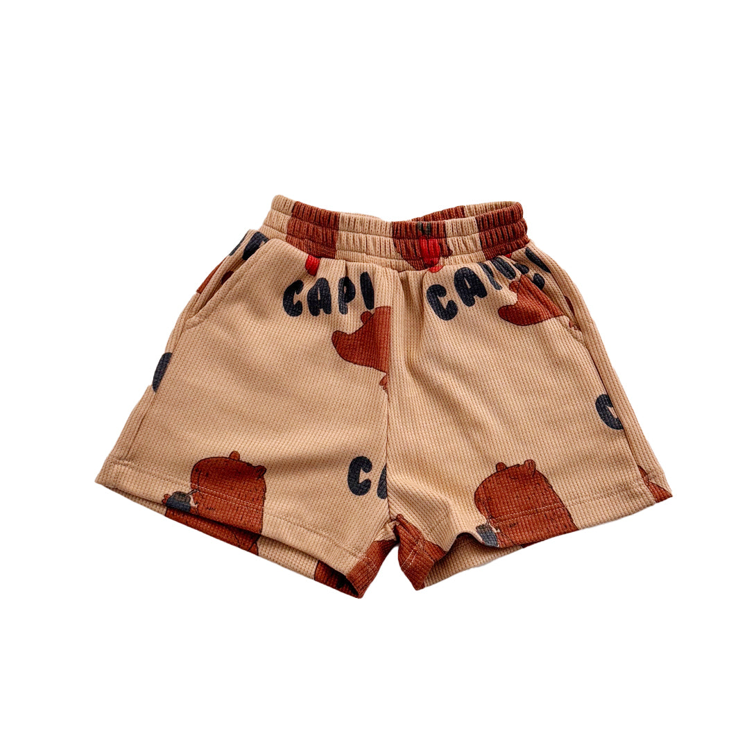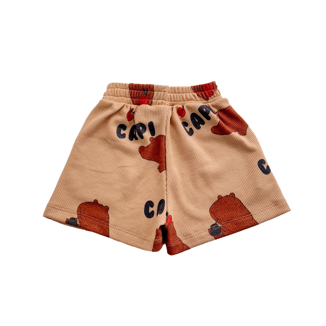 ワッフル素材の柔らかな風合いに、カピバラやフルーツのユニークなモチーフが散りばめられたショートパンツ。