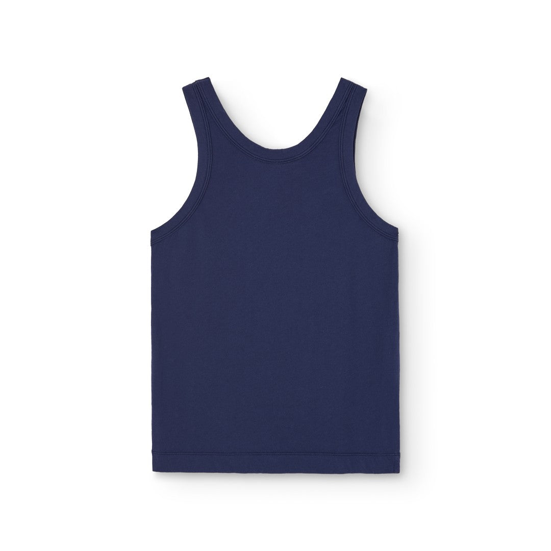 深みのあるブルーに大胆なロゴプリントが映える、タンクトップです。