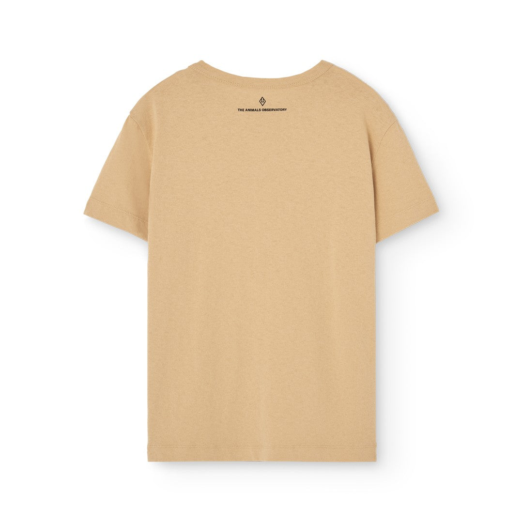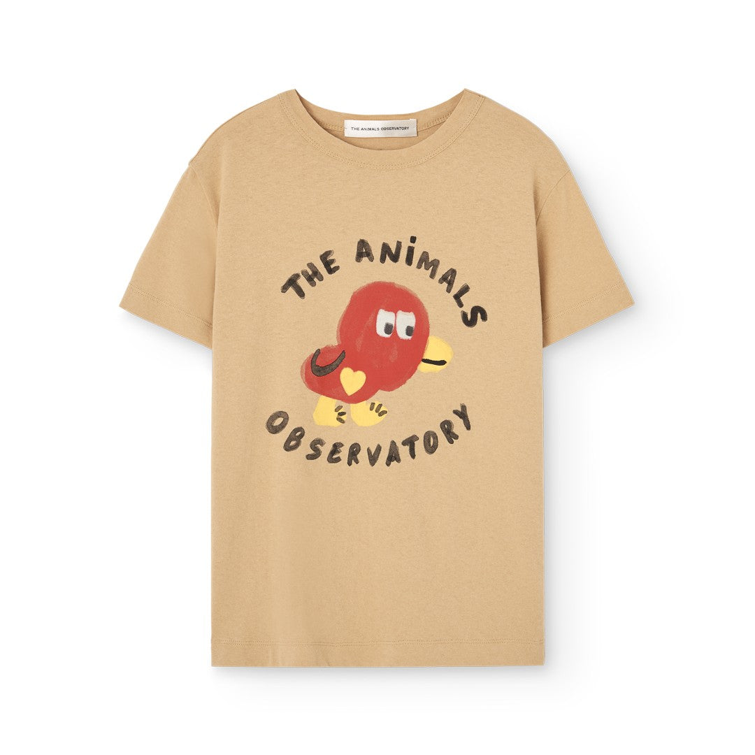 やわらかなブラウンカラーに、ユニークな鳥のイラストとロゴが映える半袖Tシャツです。
