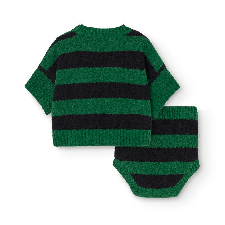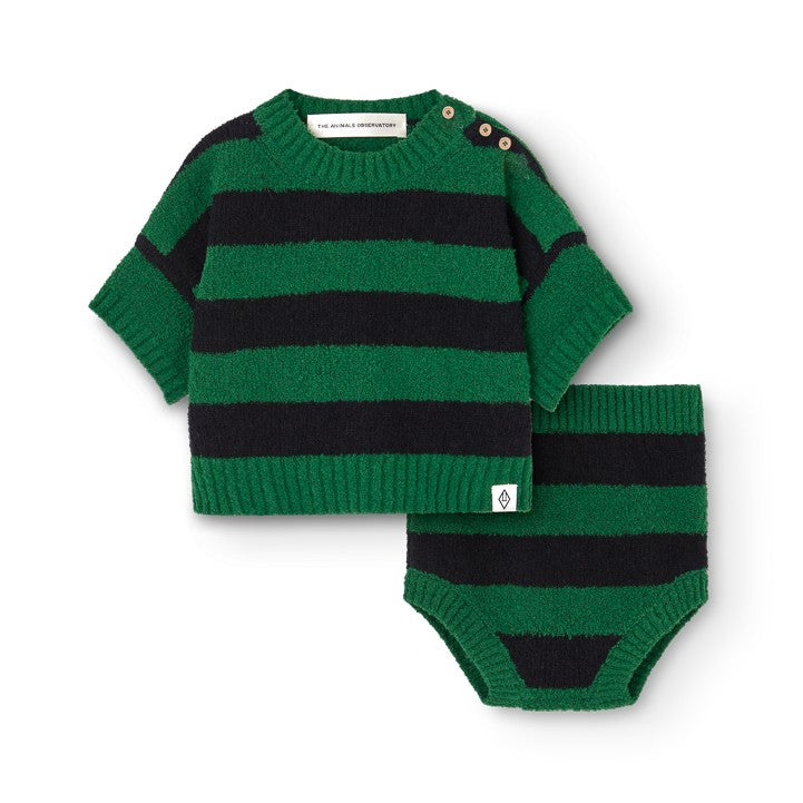 深みのあるグリーン×ブラックのボーダー柄が印象的な、ニットトップス&ブルマのベビーセットです。