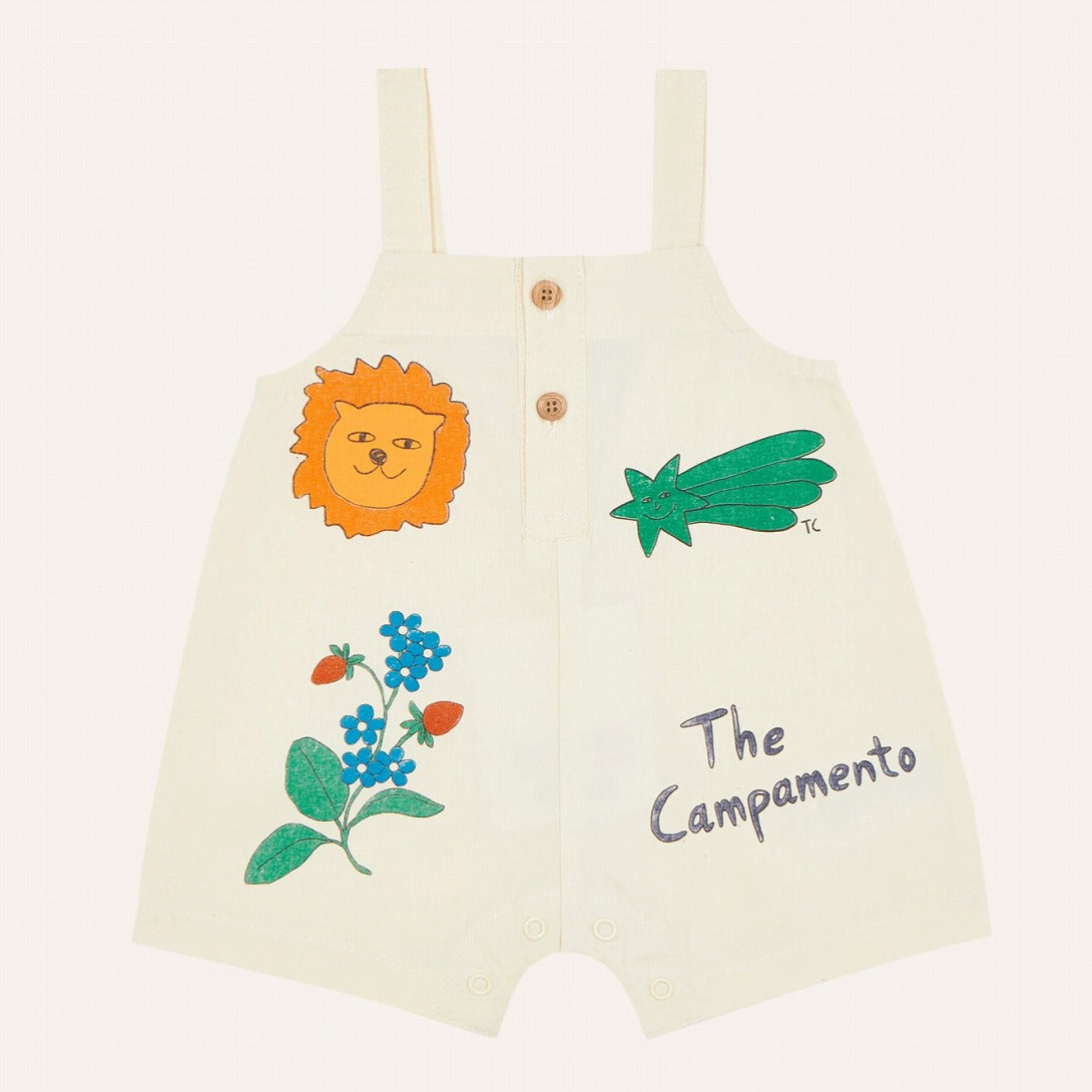 ライオンや植物などのイラストがちりばめられた、遊び心あふれるダンガリー。