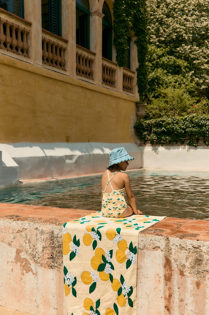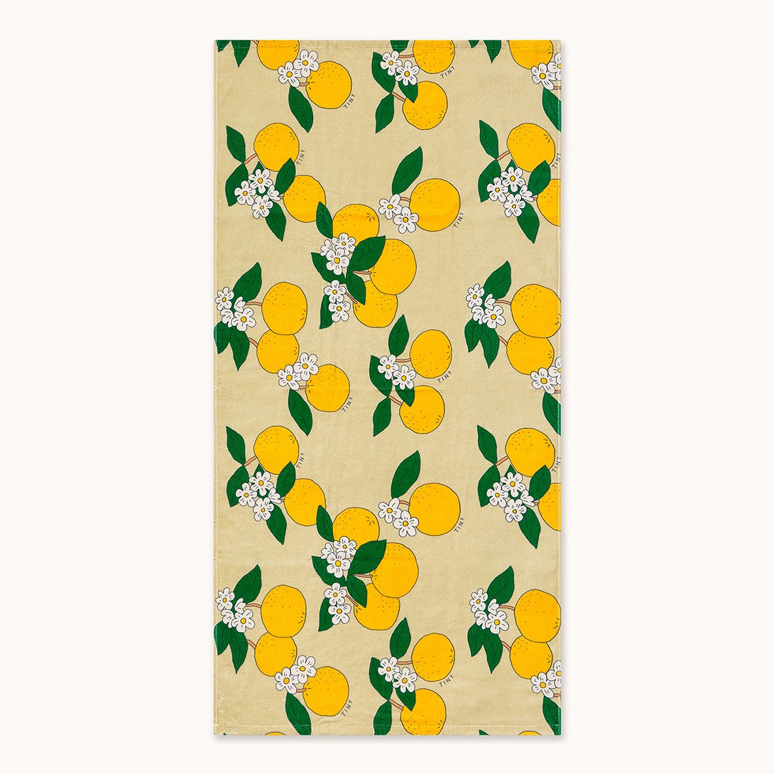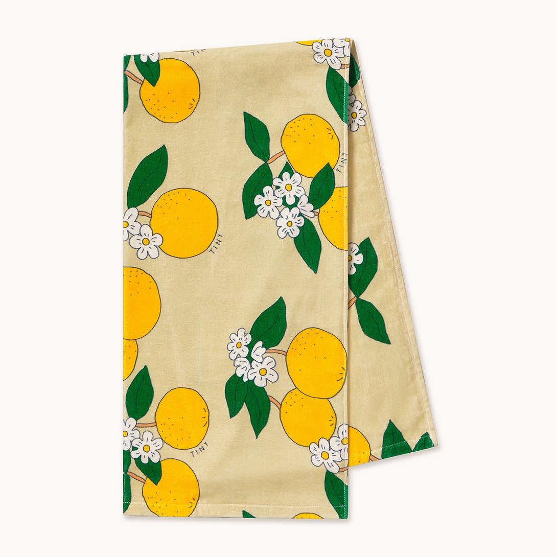 パステルイエローのベースに、オレンジと白い花柄が鮮やかに描かれたタオル。